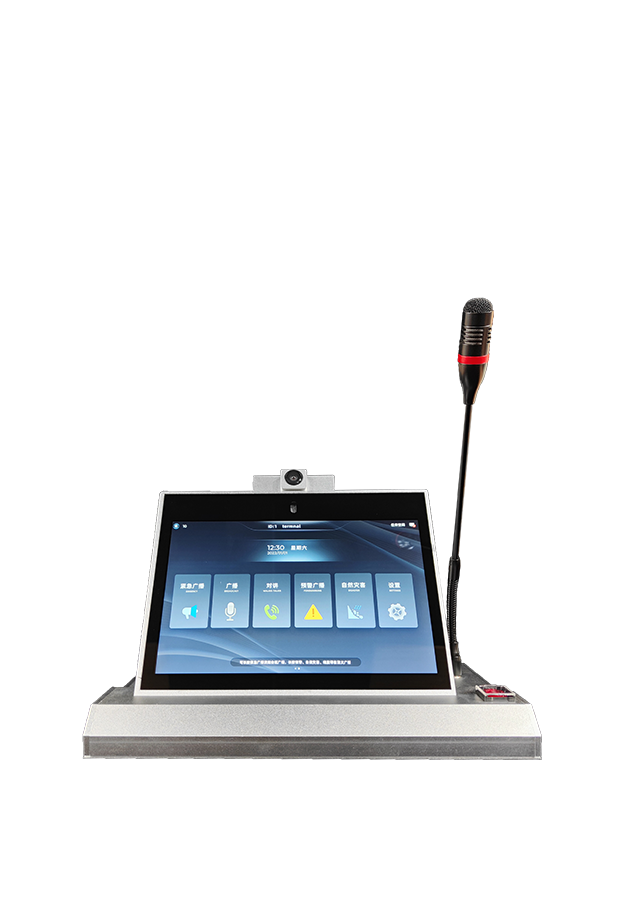 1、采用桌面式话筒设计,支持屏幕可视角度调节,带有10.1英寸电容触摸显示屏;支持通过触摸呼叫广播及发起对讲;支持呼叫终端及多个终端、呼叫分区及多个分区、呼叫全区广播;